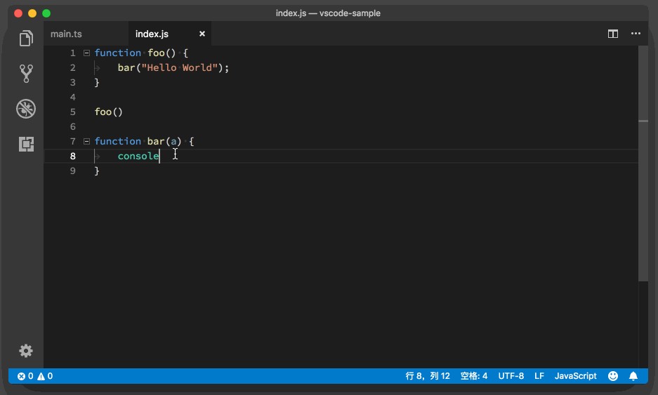 今天我们继续使用一段 JavaScript 代码来做例子。当我们在编辑器里输入 console. 之后,VS Code 里的 JavaScript 语言服务,会给我们建议与 console 相关的 API。