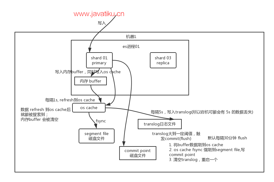 总结一下,数据先写入内存 buffer,然后每隔 1s,将数据 refresh 到 os cache,到了 os cache 数据就能被搜索到(所以我们才说 es 从写入到能被搜索到,中间有 1s 的延迟)。每隔 5s,将数据写入 translog 文件(这样如果机器宕机,内存数据全没,最多会有 5s 的数据丢失),translog 大到一定程度,或者默认每隔 30mins,会触发 commit 操作,将缓冲区的数据都 flush 到 segment file 磁盘文件中。