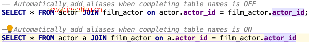 | 在表名后的完成中建议别名 | 当使用代码完成(Ctrl + 空格)时,为表名建议一个别名。![]() |