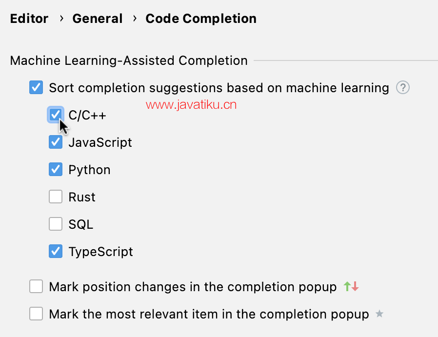 - 在机器学习辅助完成下,启用基于机器学习的排序完成建议选项,并选择要使用机器学习完成的语言。