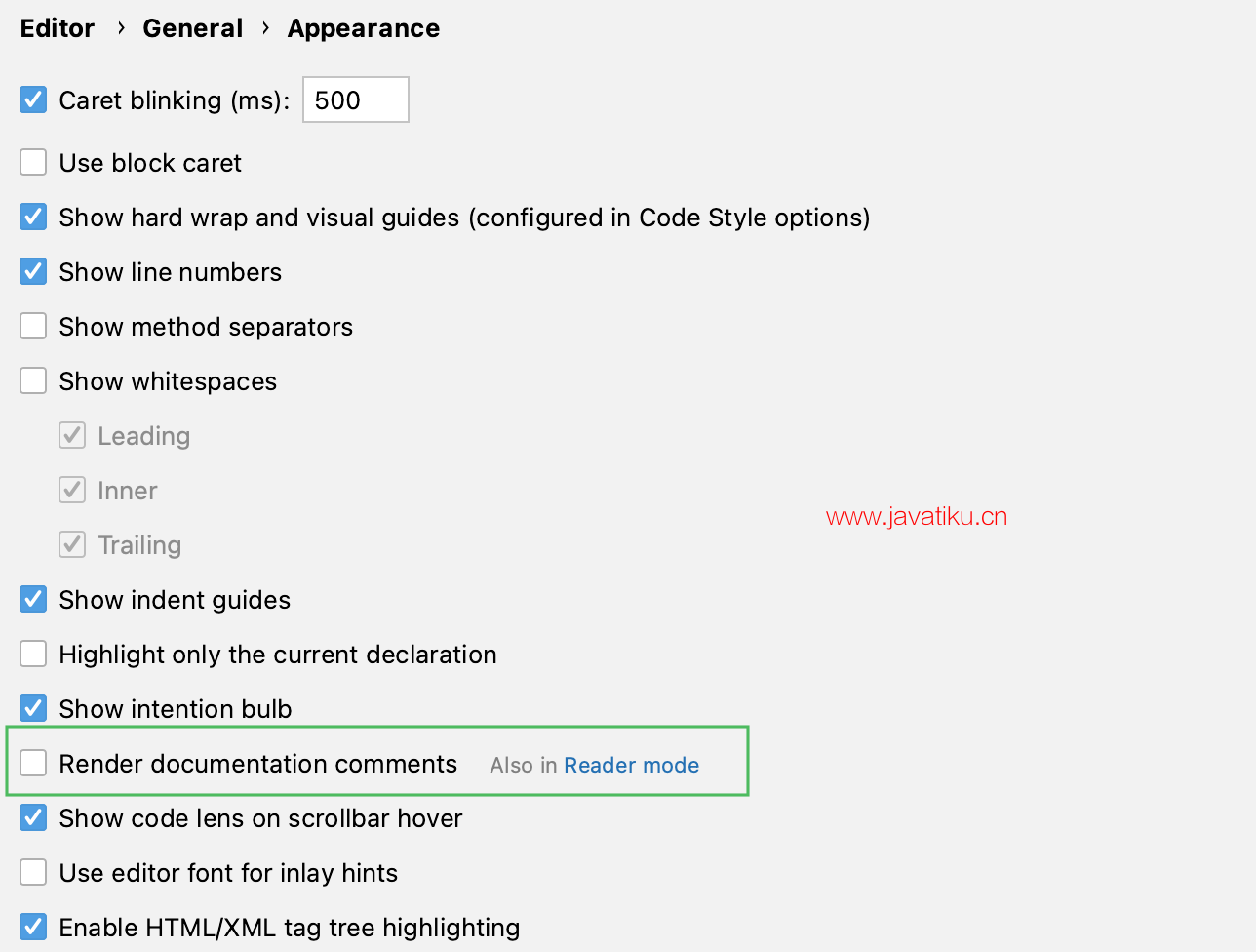 - 要默认显示所有渲染的 Doxygen 注释,请打开设置对话框(CtrlAlt+S),转到 Editor | General | Appearance,然后选中 Render documentation comments 复选框。