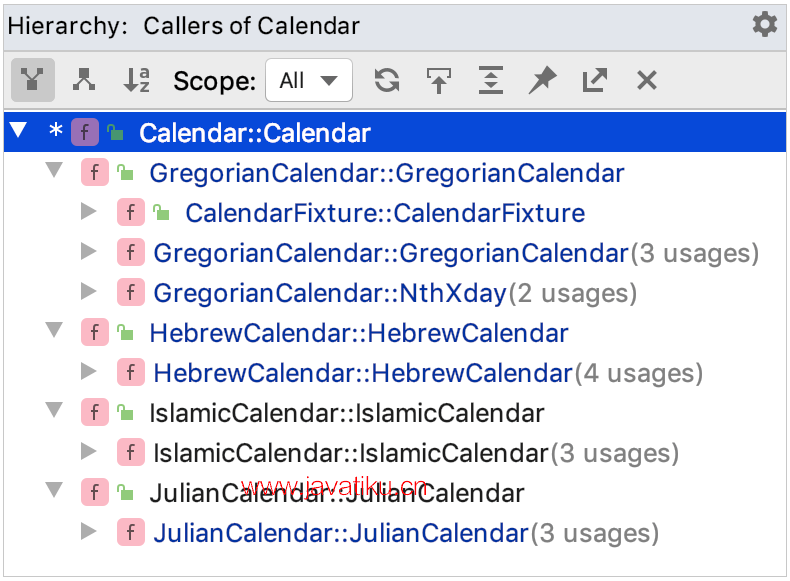 - 要构建它,请在编辑器中选择该函数,然后从主菜单中调用导航 | 调用层次结构(或按下Ctrl+Alt+H)。