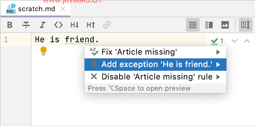 例外是您希望始终被视为正确的单词和短语。如果某个规则在一个您不希望突出显示的短语中触发了一个错误,您无需禁用此规则,因为它将不会在其他规则适用的地方触发。在这种情况下,您可以使用意图操作将该短语添加为例外。
