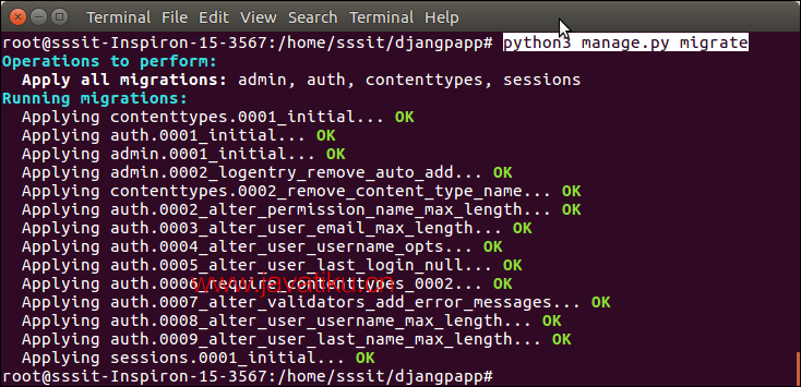 $ python3 manage.py migrate 此命令将为管理、身份验证、内容类型和会话创建表。请参阅示例。