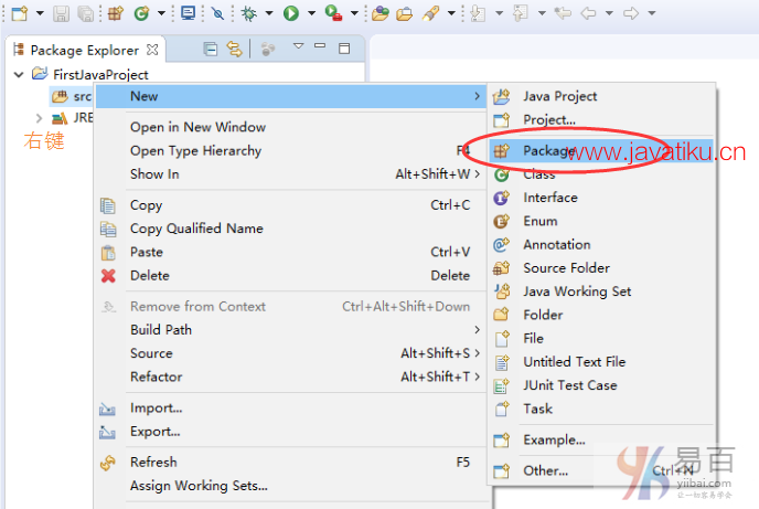 - 通过右键单击软件包资源管理器中,选择 新建→软件包(New → Package)。