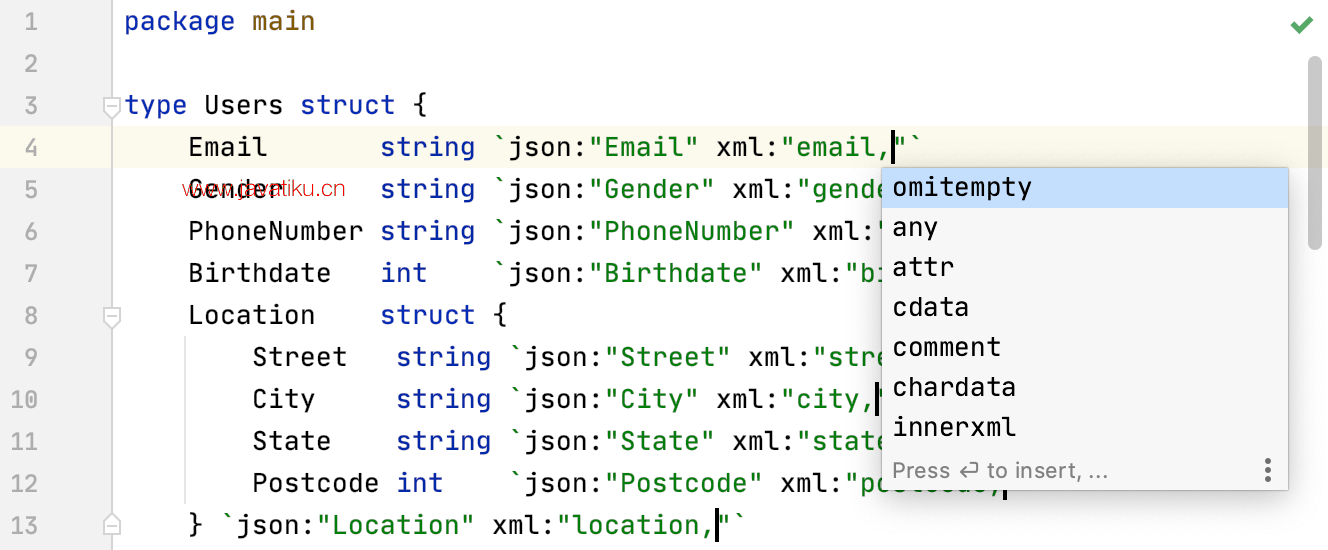 当您修改标签键时,GoLand 会显示这些标签最流行的值的列表。例如,json建议omitempty;xml有attr, cdata, chardata, innerxml, 等; asn1有optional, explicit, generalized, 等等。