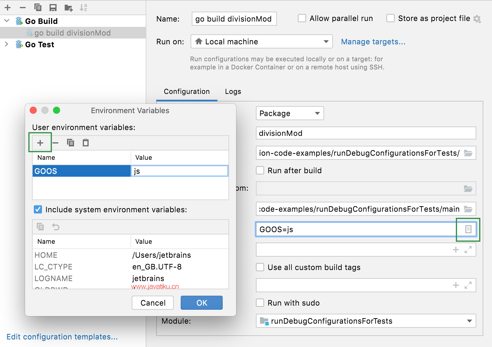 对于测试配置,GoLand 运行指定目录及其所有子目录中的所有测试。
