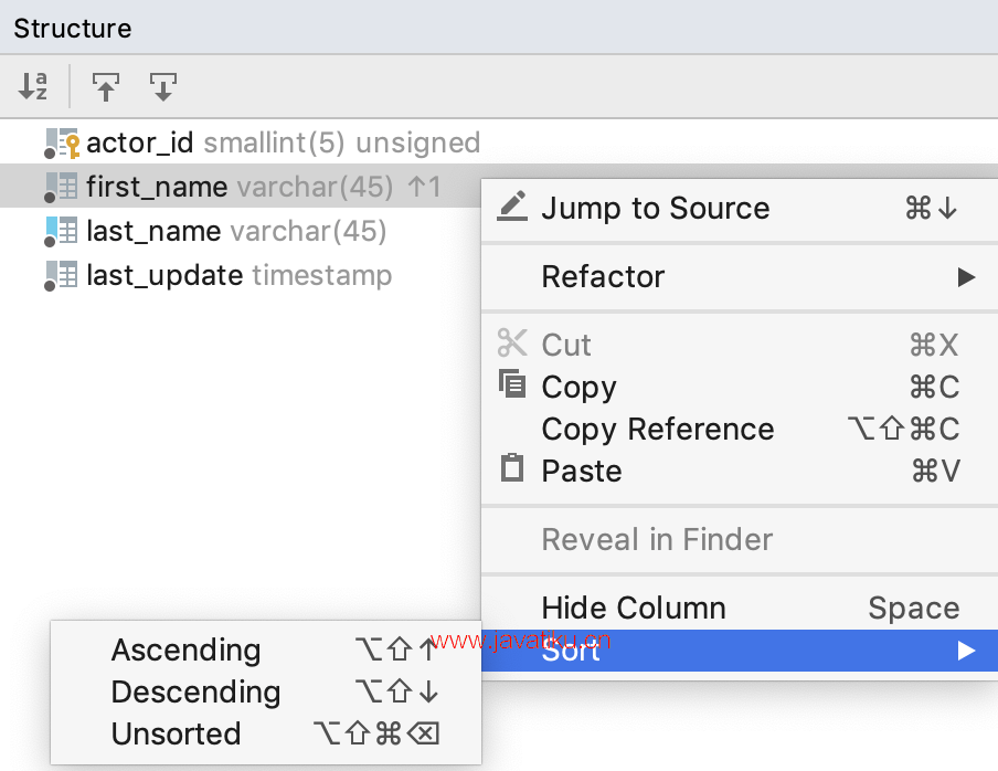 结构视图向您显示所选表中所有列的列表。结构视图在结构工具窗口(视图 | 工具窗口 | 结构)或弹出窗口 ( Ctrl+F12) 中可用。