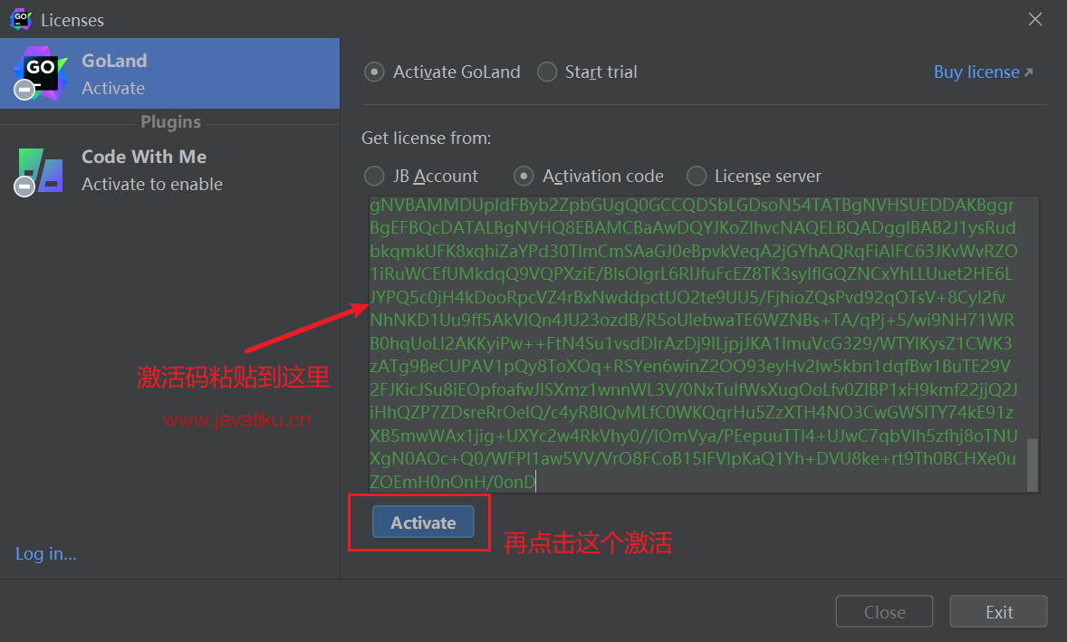 回到 GoLand ,点击 Activation code,将激活码粘贴进去,然后点击 Activate 激活。