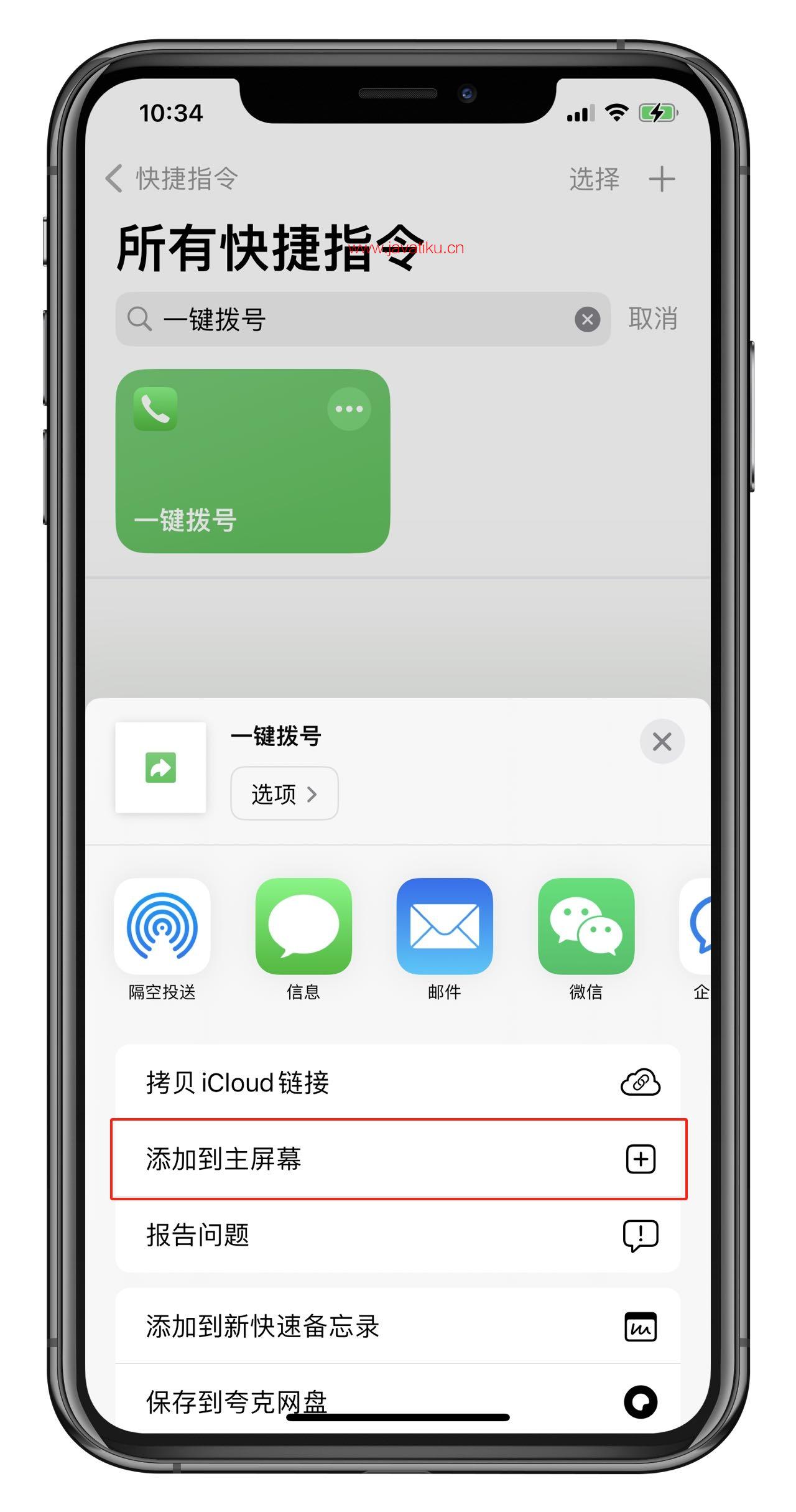 添加"一键拨号"快捷指令