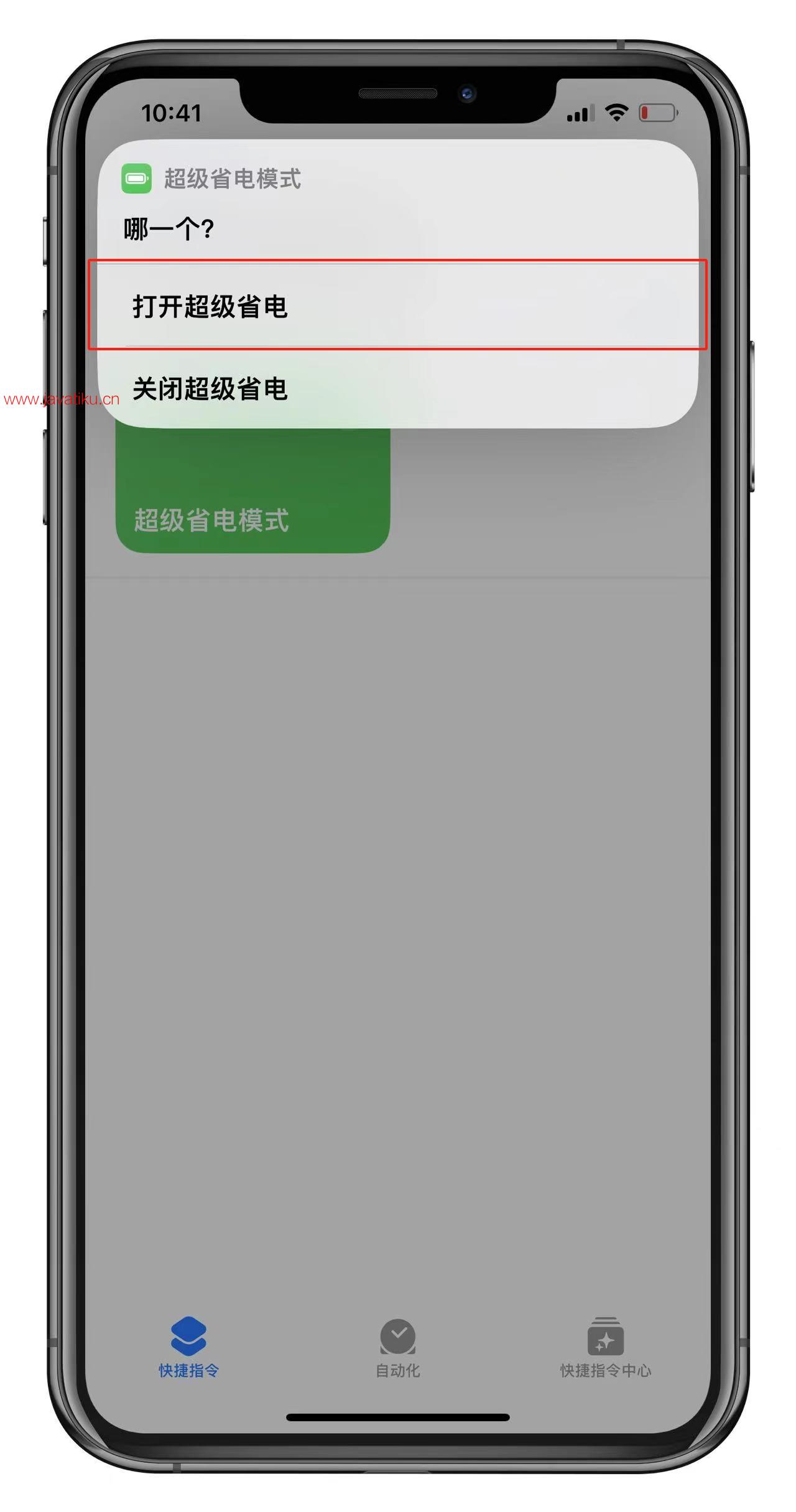 - 运行快捷指令:打开快捷指令,找到"超级省电模式"快捷指令,并点击运行。