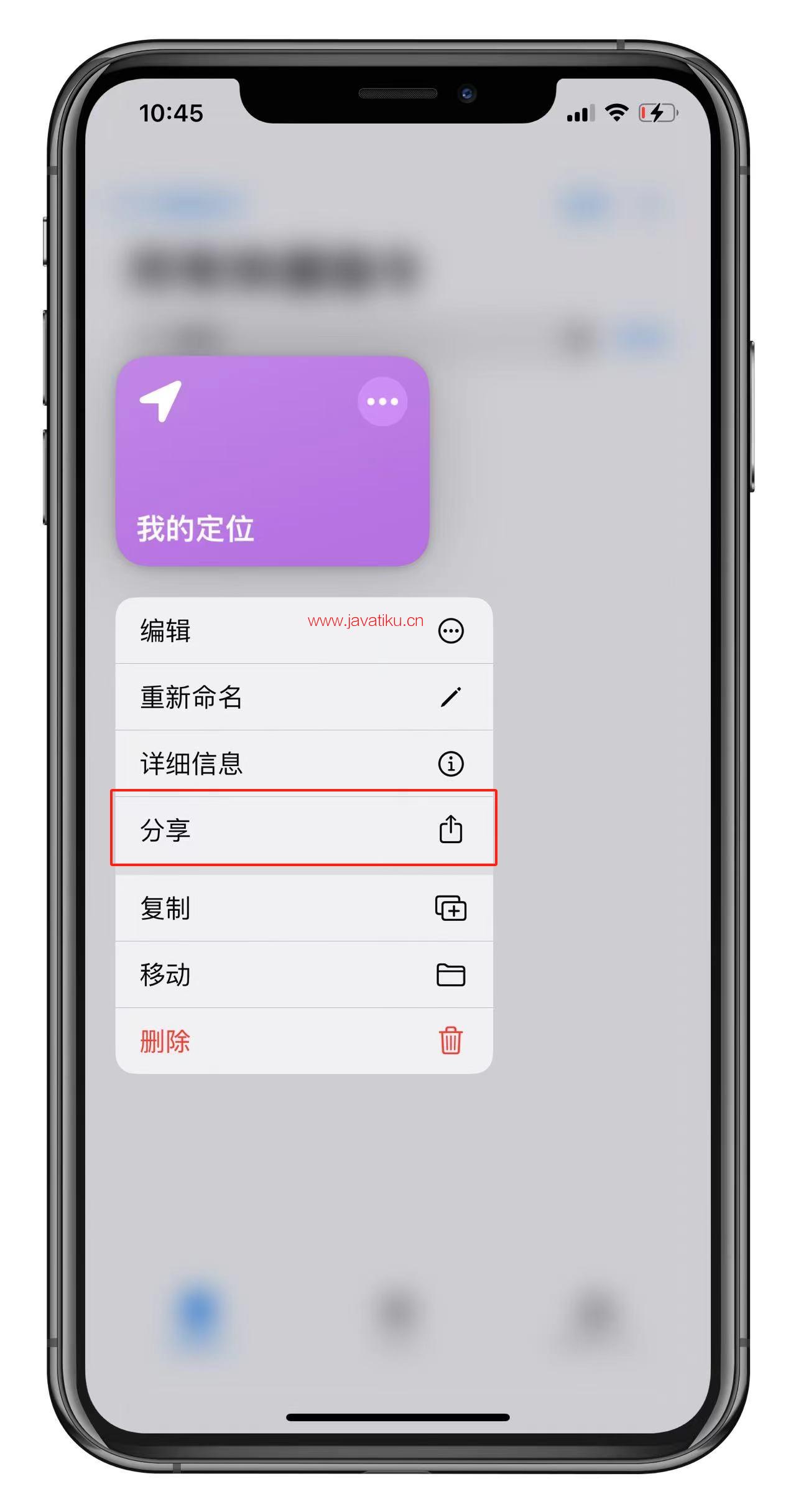 - 长按快捷指令:打开快捷指令,找到"我的定位"快捷指令,并长按快捷指令。