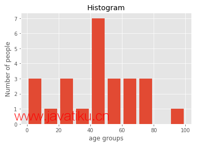 例如,我们取不同年龄组的人的数据,并根据箱体绘制直方图。现在,箱体代表被划分为一系列区间的值范围。箱体通常是大小相同的。
