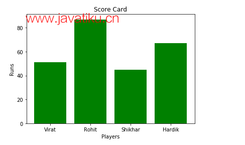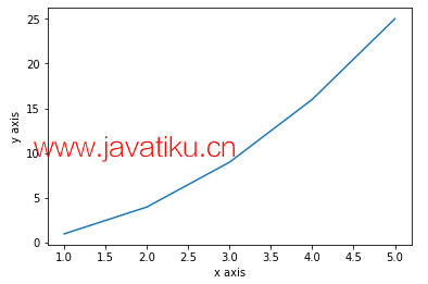 在上述程序中,它绘制了一个图形,x 轴的范围从 0-4,y 轴从 1-5。如果我们提供单个列表给 plot(),matplotlib 假定它是 y 值的序列,并自动生成 x 值。因为我们知道 python 索引从 0 开始,所以默认的 x 向量与 y 有相同的长度,但从 0 开始。因此,x 数据是 [0, 1, 2, 3, 4]。