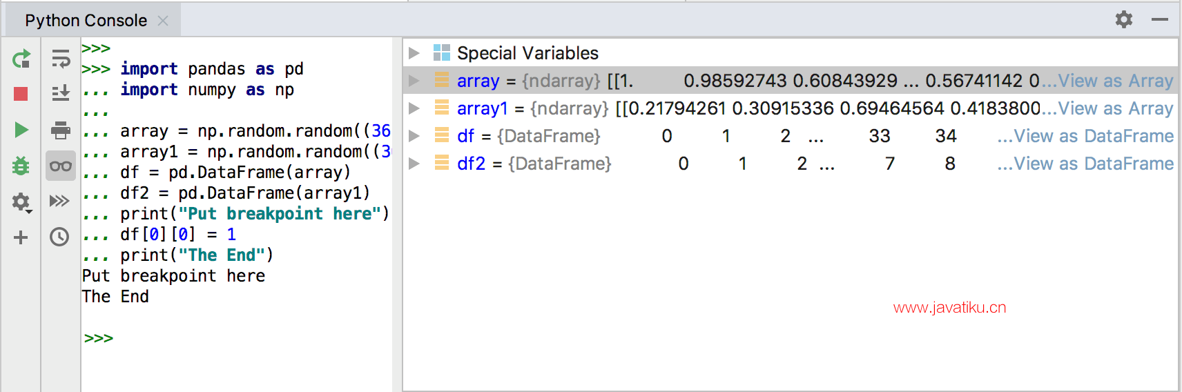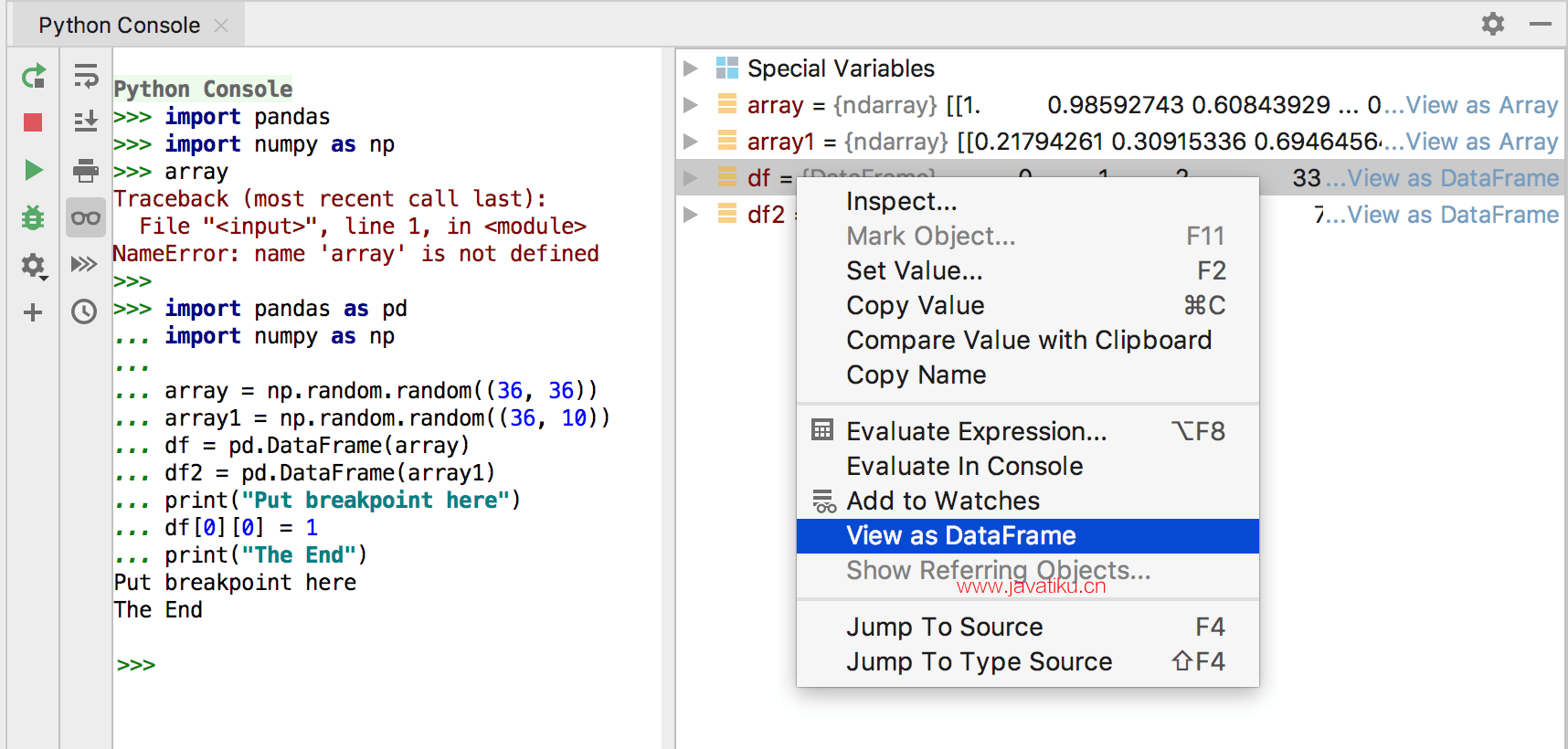 - 从变量的上下文菜单中,选择View as Array / View as DataFrame: