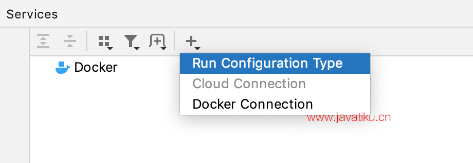 2. 在Services工具窗口中,单击Add service,然后选择Run Configuration Type。