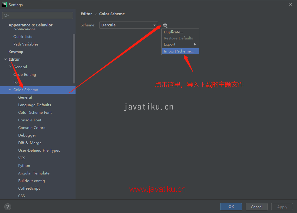 可以在线直接安装,也可以从官网下载自己喜欢的主题,然后在Settings界面中Editor -> color Scheme 中进行安装,如下图