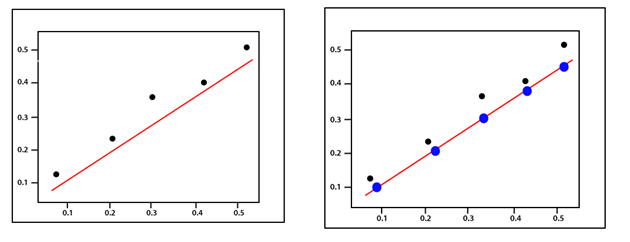 假设我们有一组值,我们首先按照之前的方式用一组随机的权重和偏差值画出一些回归线参数。