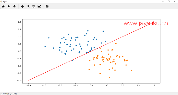 感知器模型的训练与线性回归模型类似。我们初始化一个具有两个输入节点的输入层和一个具有Sigmoid激活函数的输出节点的神经模型。当我们将模型与数据绘制在一起时,我们发现它并不很好地适应我们的数据。我们需要训练这个模型,使其具有最佳的权重和偏置参数,并适应这些数据。