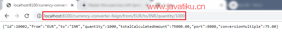 步骤8: 打开浏览器,输入URL http://localhost:8100/currency-converter-feign/from/EUR/to/INR/quantity/1000。