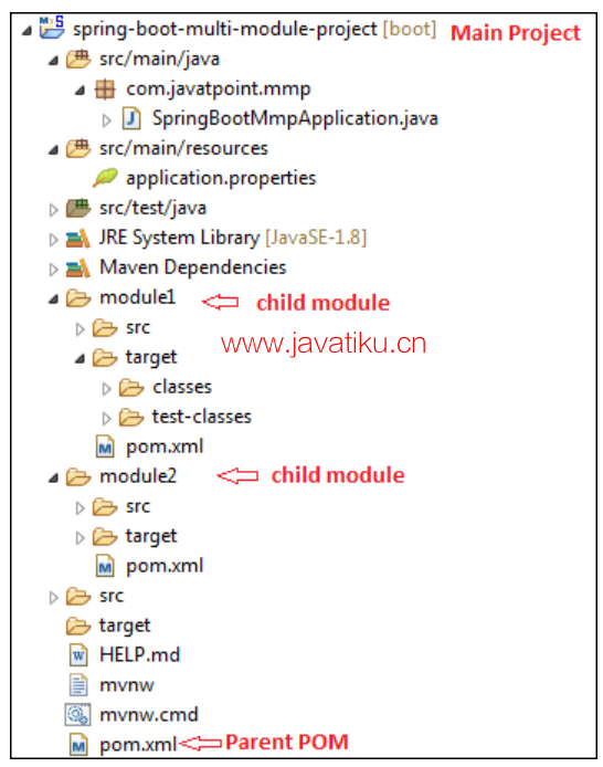 在下面的图片中,我们创建了一个名为 spring-boot-multi-module-project 的项目。它包含了位于目录底部的父 POM。之后,我们创建了两个 Maven 模块,分别命名为 module1 和 module2。这两个模块包含了各自的 pom 文件。
