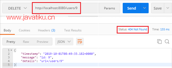 在下面的图片中,我们试图删除用户 id 为 9,但该用户不存在。因此它返回了 Status: 404 Not Found。