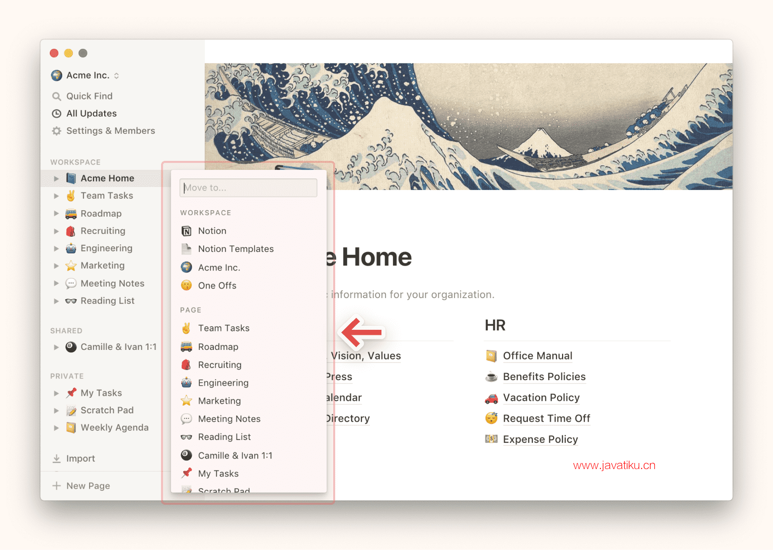 Move To(移动至)时,会弹出另一个菜单,让你选择将页面移动的目标工作区或页面。还可以使用文本框快速搜索目标工作区或页面,按下 enter 即可实现移动。
