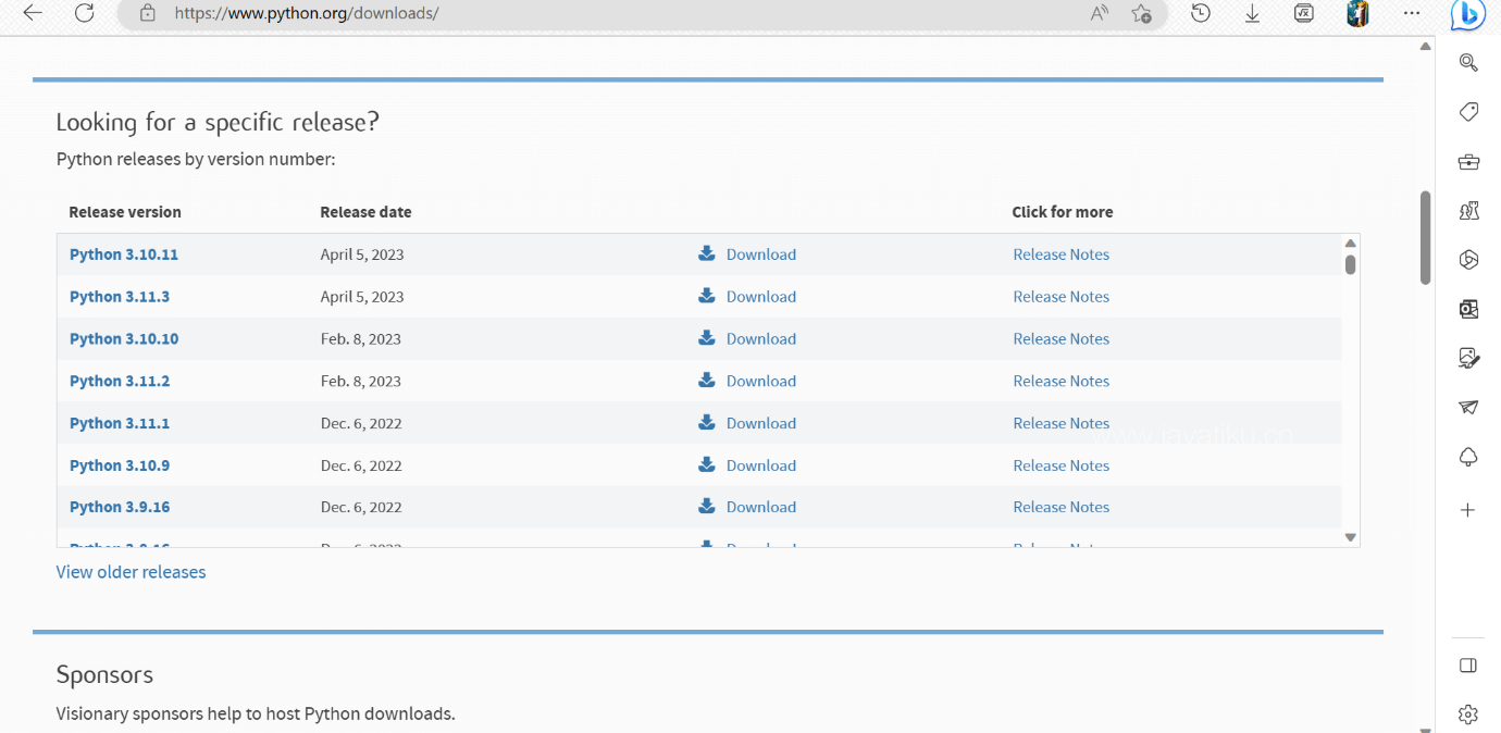 如果你想下载特定版本的 Python,则可以继续向下滚动以查看版本 2 和 3。分别单击你想下载的版本号旁边的下载按钮。