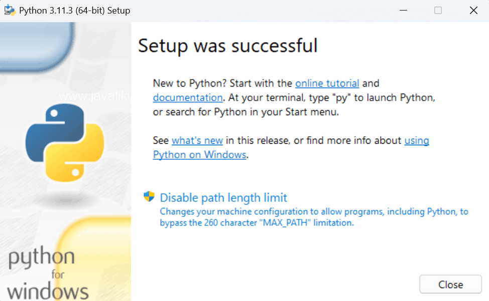 设置正在进行中。所有 Python 库、包和其他 Python 默认文件都将安装在我们的系统中。安装成功后,将出现以下页面,显示“安装成功”。
