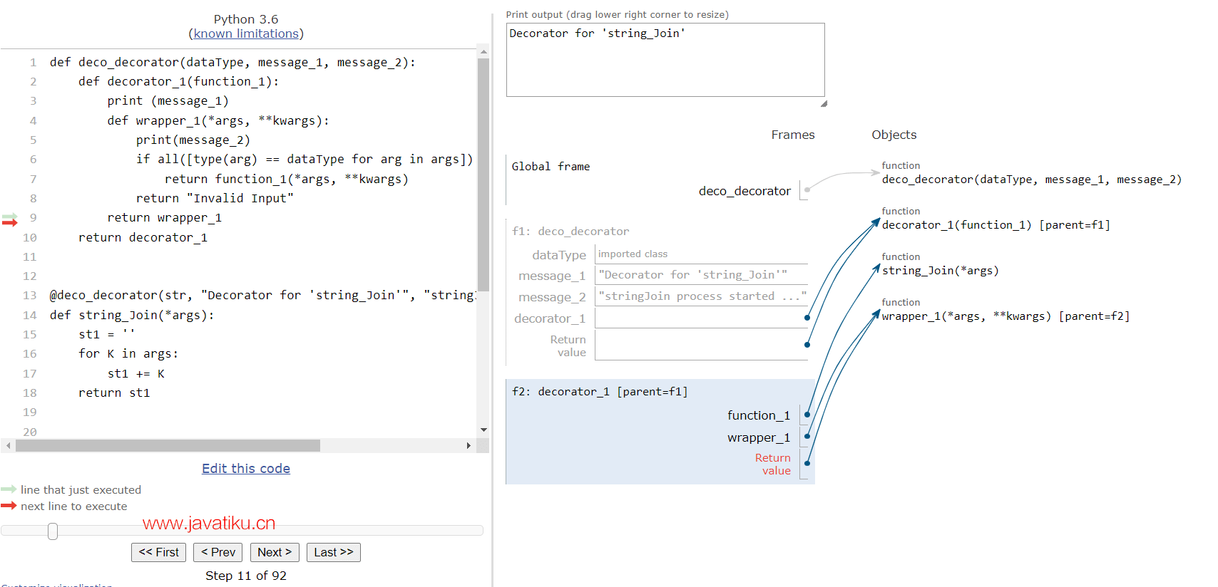 """ 当我们执行这段代码时,执行将从左到右开始,将调用decorator(params)以返回函数对象func_obj。通过使用func_obj调用func_obj(function_name)。在内部函数中,将执行所需的操作,并将实际函数引用返回以分配给function_name。现在,用户可以使用function_name()来调用已应用装饰器的函数。