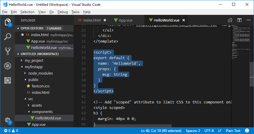 <script>部分: 此部分导出为名为'HelloWorld'的组件,并且要显示在输出中的数据存储在“msg”变量中。
