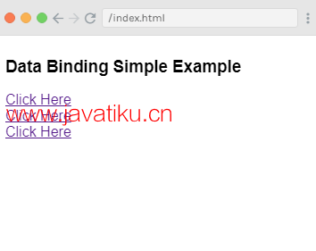 <a v-bind:href="hreflink" target="_blank">Click Here</a> <br>我们还为hreflink变量指定了一个值:"http://www.javatiku.cn",用于href。