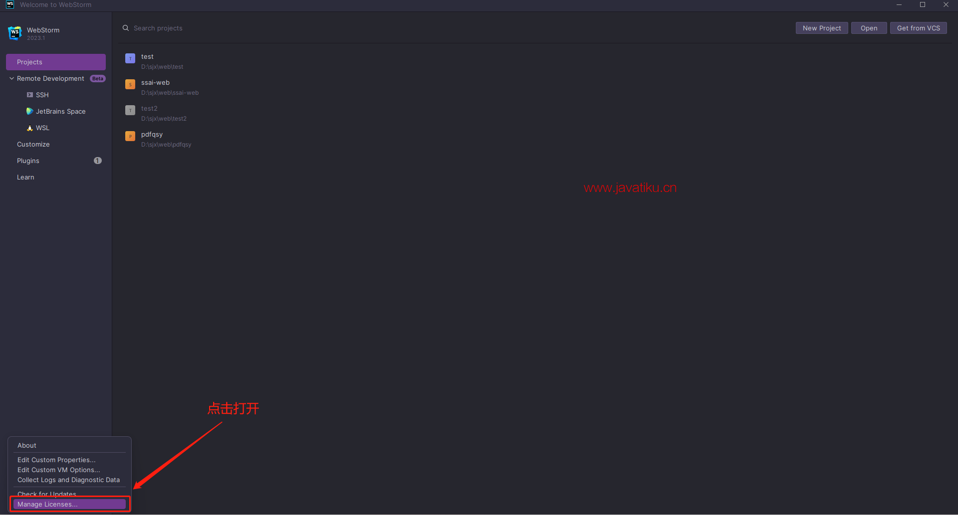 打开WebStorm,然后点击左下角的设置,点击“Manage Licenses...”如下图所示。