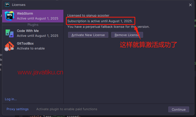 步骤 8:完成激活 如下图,在激活成功后,点击“Continue”关闭窗口即可。现在您应该可以正常使用WebStorm的所有功能了。