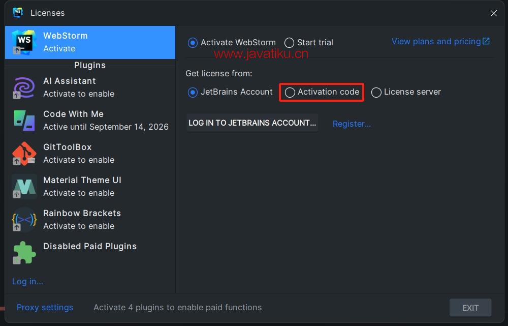 打开 WebStorm,如下图所示点击 Activation code 。