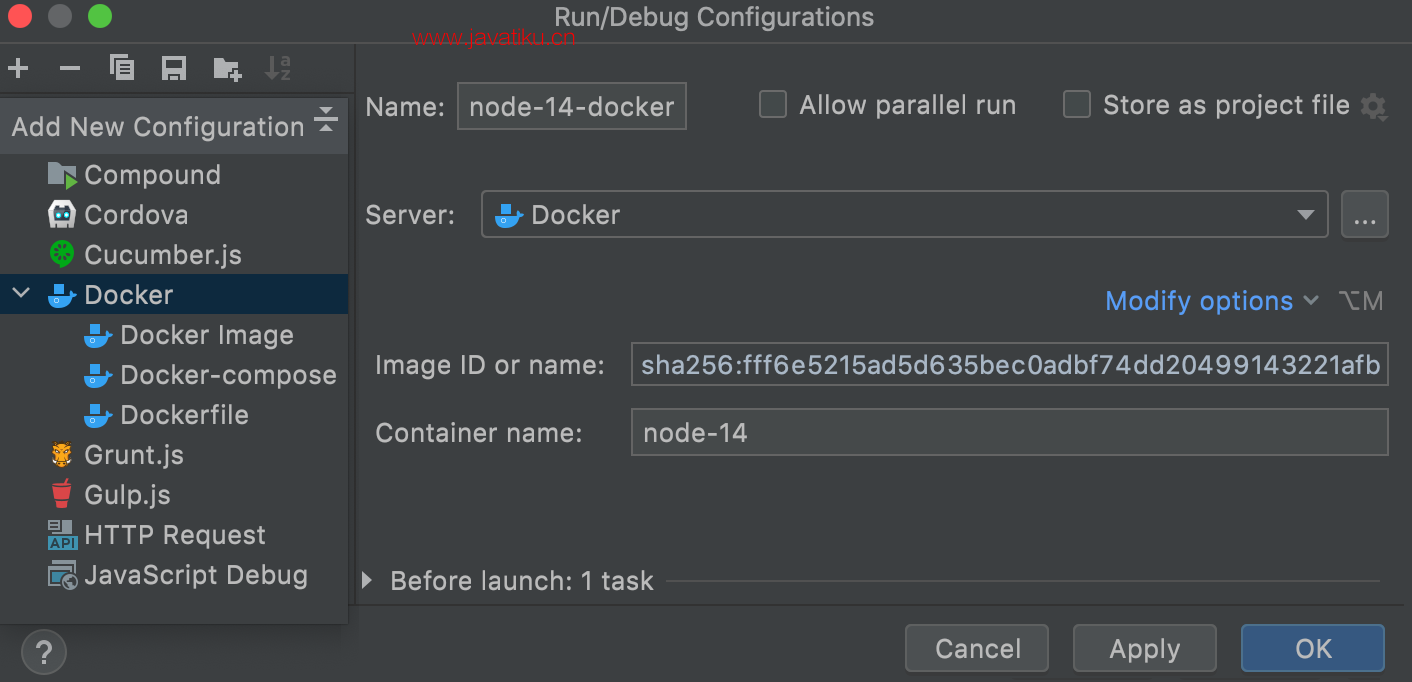 Docker 容器是相应镜像的运行时实例。WebStorm 使用运行配置来执行构建 Docker 镜像和运行容器的命令。Docker 运行配置分为三种类型:
